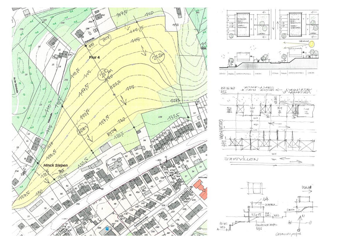 Machbarkeitsstudie, Städtebauliches Konzept für ein neues Quartier, klimaneutral, ökologisch, nachhaltig, skizzenhafte Ideen für Einfamilien-, Mehrfamilien- und Reihenhäuser in Hanglage als Vorlage für ein Gespräch bei der Baubehörde.